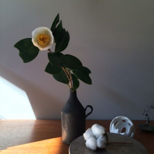 みたてさんで椿を購入した。葉が割れていたので、おまけに固めの蕾がついた椿をもう一輪頂いた。今朝咲き始め、その花の開いた様子がゆで卵の断片に見える、と3人に言われた。